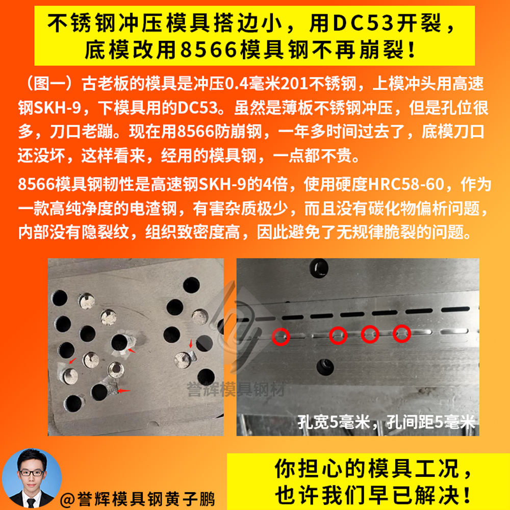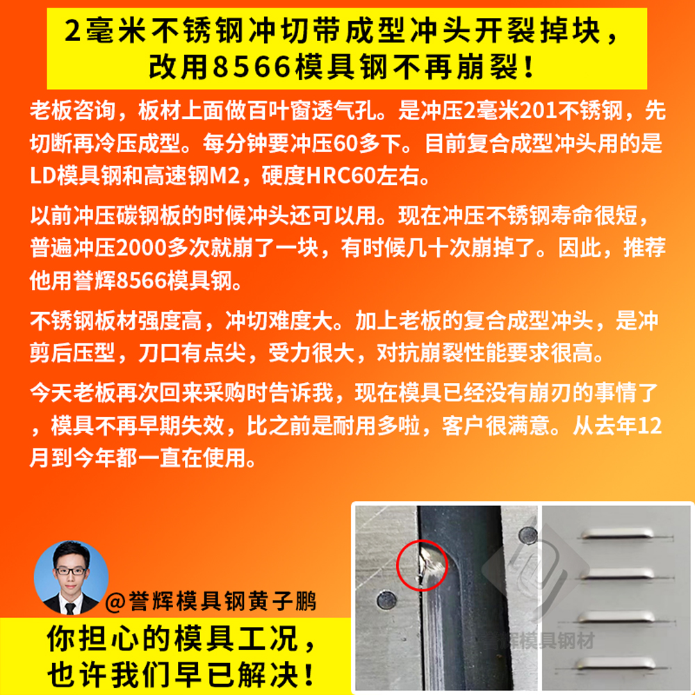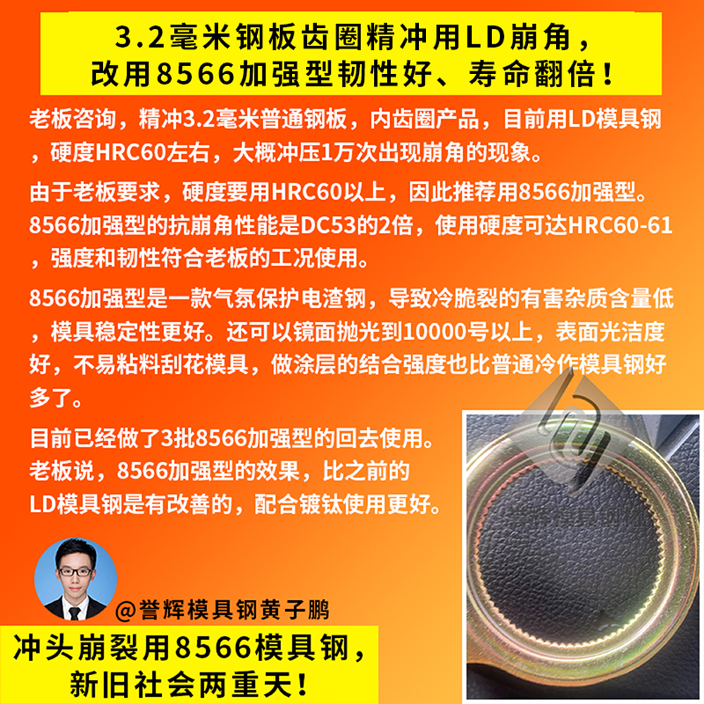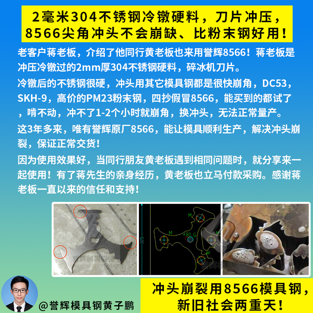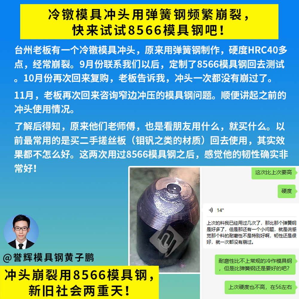 感谢台州老板再次采购高韧性的8566模具钢,用于冷镦模具冲头使用。台州老板是23年10月来咨询的,他当时的冷镦冲头,是用弹簧钢做的,硬度HRC40多点,会崩掉一大块,修都没法修那种。所以台州老板来咨询我,有什么好用的模具钢推荐。因为台州老板是做冷镦铁料的,所以我还是按照经验,给他推荐用誉辉8566模具钢,第一次帮他定做了一小段直径45的来试模。过了2个星期,台州老板就发来信息说,要再买一条600长的8566模具钢。上次的8566冲头已经加工好在用了,打了几万模都很顺,没有崩过,挺好用的。【誉辉模具钢黄子鹏日记第1217篇】