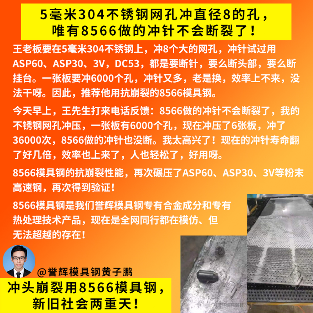 特别是在厚板冲压、小孔径冲压、窄边冲压、尖角冲压、冷镦模具等等的残酷工况,誉辉8566模具钢已经分享了过千个成功案例。冲头崩裂用8566模具钢,新旧社会两重天!不仅是一句广告语,更是过千真实用户的心声和呐喊!
